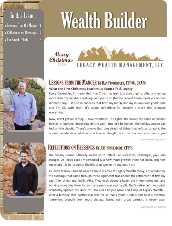 Every quarter, we send out a newsletter to share thoughts and feelings on various topics around the financial industry. However, the Christmas newsletter is a time where advisors share non-financial thoughts and personal stories. In this season’s newsletter, Dan reminds us what really matters this season, Jeff encourages us to see our blessings, and Nate sparks a little playful debate with “before” or “after” Thanksgiving.